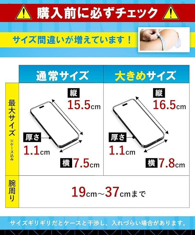 ✅【⭐対応スマホサイズ⭐】アームバンドは(通常)と(大きめ)の2つのサイズがあります。ケース込みの対応スマホサイズは次の通りです。(通常サイズ)→縦15.5cm、横7.5cm、厚さ1.1cm (大きめサイズ)→縦16.5cm、横7.8cm、厚さ1.1cm ※カメラの出っ張り等も考慮した上でご検討ください。iPhone 17/16/15/14/13/12/11 Android AQUOS/Galaxy/Google Pixel/Xperia などに対応。