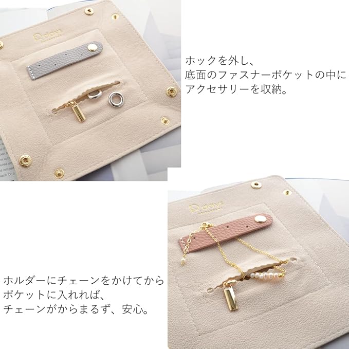 【持ち物もコンパクトに】ホックを外し、ファスナーポケットにアクセサリーを入れて半分に折って。トレーにアクセサリーを収納できるから、旅の持ち物もコンパクトに。