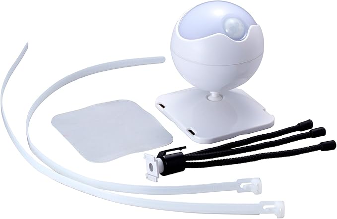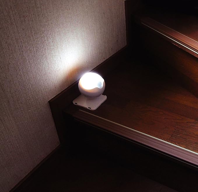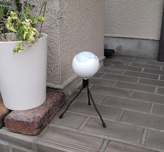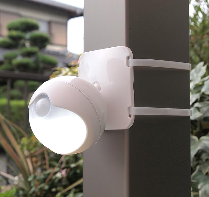 人が近づくとパッと点灯するセンサーライト。 防雨タイプなので屋外でも使用可。 台座、結束バンド、自由に曲がる三脚が付属。置いても掛けても巻きつけても使える。 足元ライトや防犯ライトなどに。