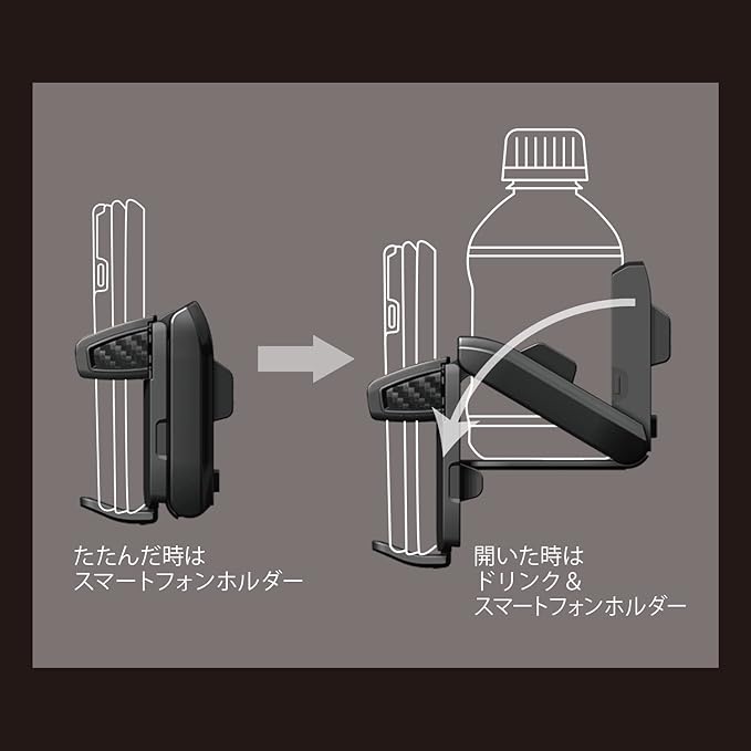 たたんだ時はスマートフォンホルダー、開いたときはドリンク&スマートフォンホルダーとして使用できます