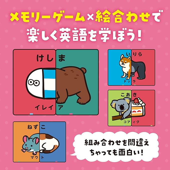 まえカードとうしろカードの英語を合わせて単語をつくり、裏返したときにその単語に合ったイラストになったらカードをもらえます。