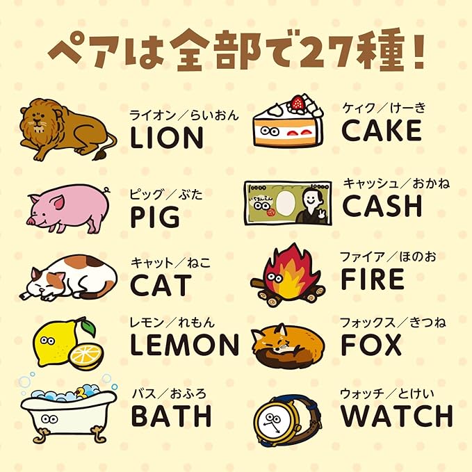 まえカードと組み合わて単語ができるうしろカードは複数パターンあるため、英単語を作っても、裏返すまでは単語とイラストが一致しているかは分からないという運要素も入ったカードゲームです。