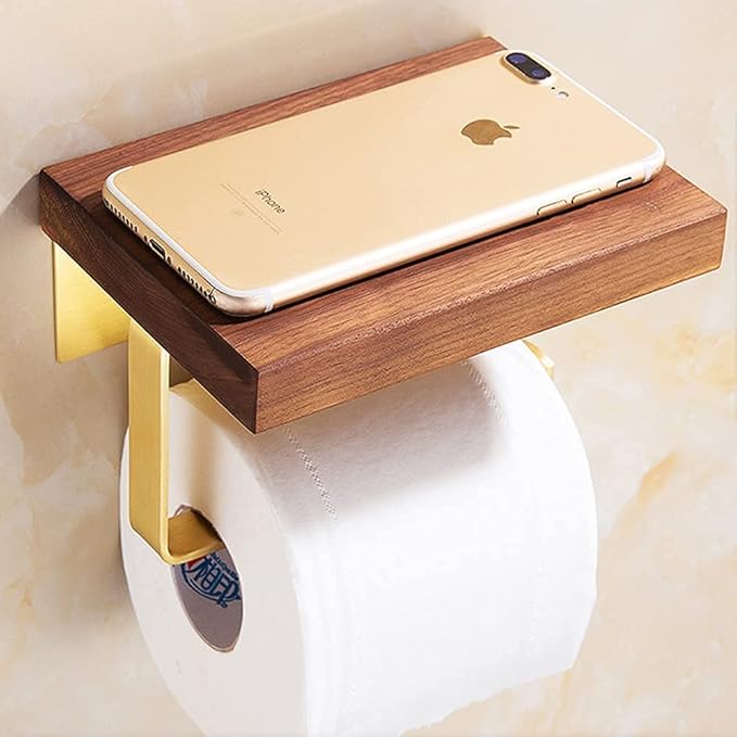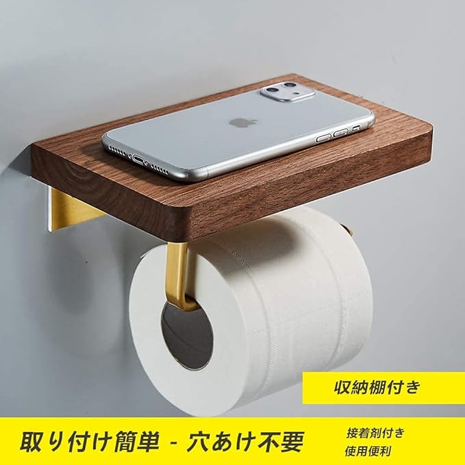 L&L トイレットペーパーホルダー 収納 壁掛け スマホ置き 小物置き棚付 天然木製 上質 おしゃれ 和風 紙巻き器 穴あけ不要 粘着とネジ取付できる 取付簡単 耐荷重10kg キッチン/バスルーム/洗面所/寝室