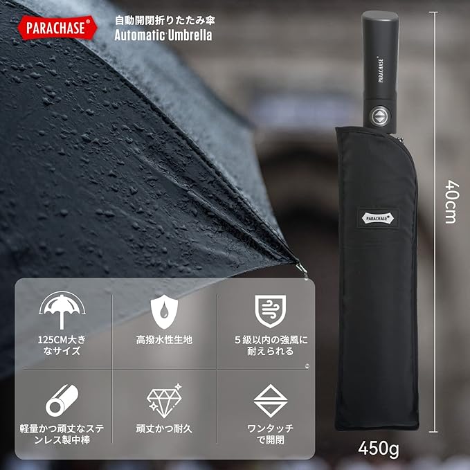 折りたたみ傘 メンズ用 自動開閉 大判サイズ 弧長140cm 強風に負けないグラスファイバー製