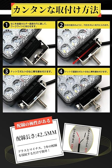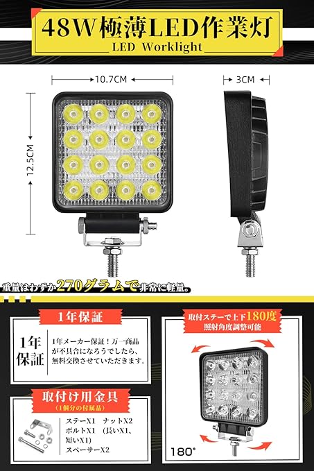 LED POWER:48W(16個* 3WハイパワーLED) 防水レベル:IP67 発光色:ホワイト ルーメン:3360LM 電圧:DC10V-30V 照射角:狭角タイプ(光角度:30 ) サイズ:(約)125X107X30(mm) 内容:ランプ 2個、取り付けネジ 2式