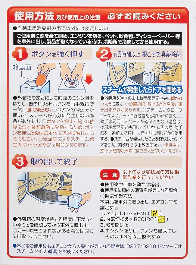 ●ボタンを押すだけでじっくりと車内の内装に浸透して強力消臭!●消臭成分は病院やレストランの業務用としても使われている「安定化二酸化塩素」なので、強力なのに安心&安全●作業もカンタン!PUSHボタンを押すだけ●作業時間は1分+6時間(設置1分、放置6時間)●香りでごまかさない除菌、消臭剤