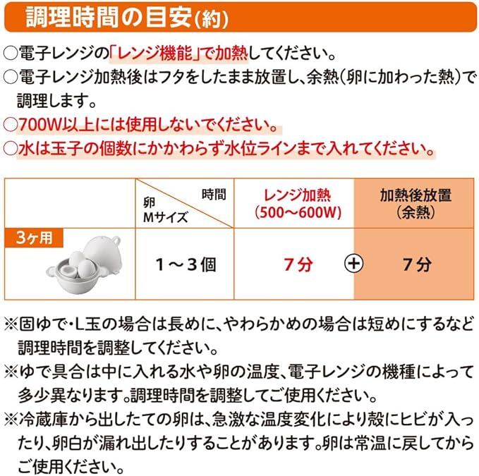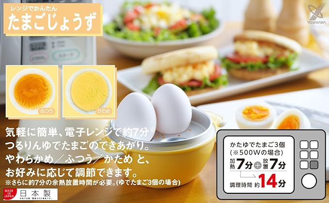 「ヨシカワ レンジでかんたん たまごじょうず SH8092」は、一度に3個のゆでたまごが作れます。時間を調節することで半熟から固めまでお好みに応じたゆでたまごができます。