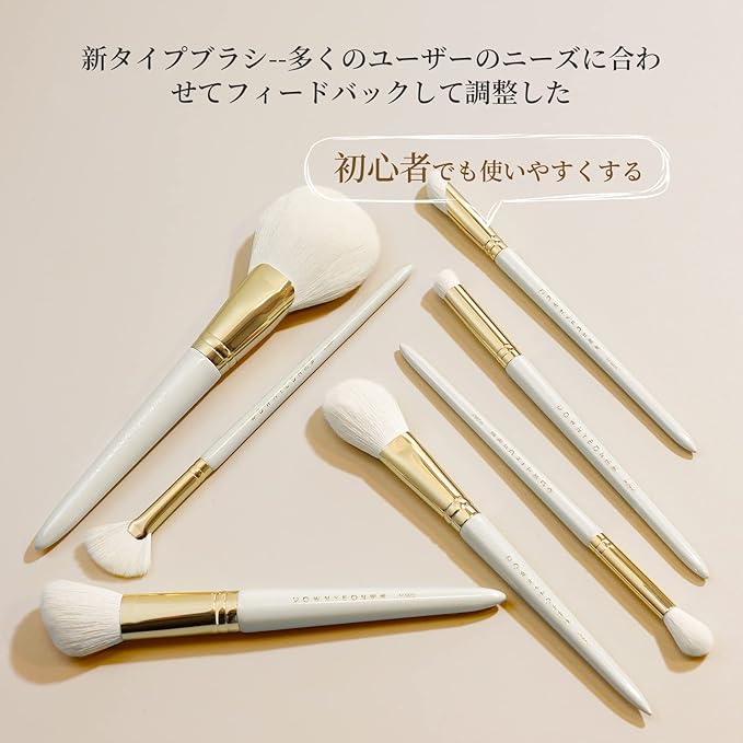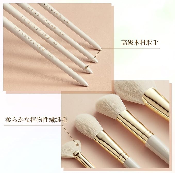 【素材】化粧筆は全て手作業で製造されており、丈夫で長く利用できます。毛先は高級植物性繊維毛を採用しており、毛の密度が高く肌当たりが良いので、使い心地がいいです。粉含み力抜群、肌にキレイに発色します。敏感肌にも適用しています。