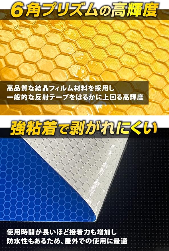 本製品の反射テープは、安全に欠かせない反射テープです。6角プリズムデザインで、一般的な反射テープをはるかに上回る高輝度ですので、ドライバーから視認されにくく事故の危険性も高まる、夜間の安全にぜひお役立てください。テープタイプで好きな長さにカットでき、また、電源要らずで経済的な一面もあります◎