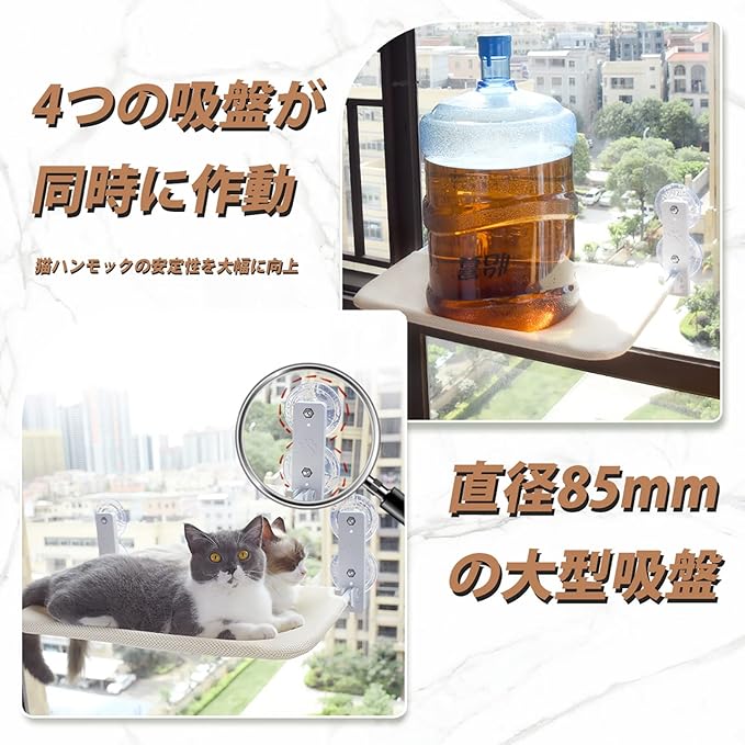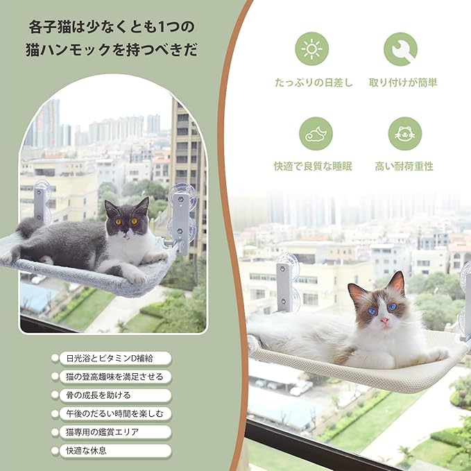 【猫窓用ハンモック】:高いところが大好きな猫ちゃんに設計した、吸盤タイプ式猫窓用ハンモック、調節簡単でどこでも自由に設置可能です。吸盤タイプなので猫ちゃんの成長に合わせて高さを変えられ、お気に入りの場所が更に刺激的に。安定感にもご心配なく、耐荷重15KGです。