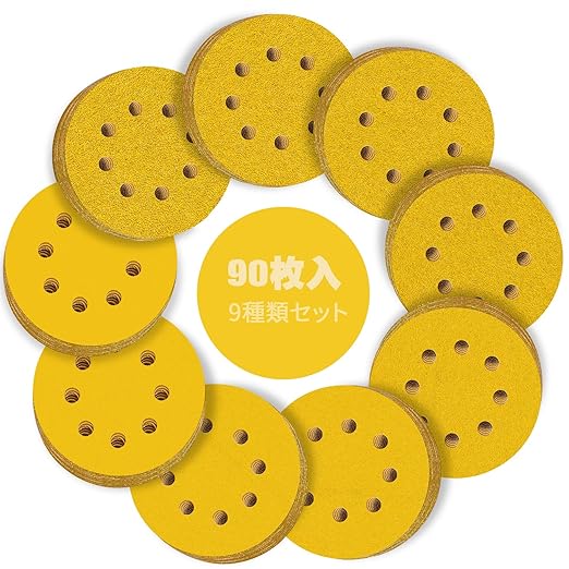 サンディングディスク 125mm 9種類90枚入セット マジック式 ランダムサンダー ペーパー 8穴 丸型 高温焼成プロセス ディスクペーパー,金属磨き 木工DIY作業に 車の研磨(#40#60#80#120#180#240#400#600#800 各10枚)電動サンダー用サンドペーパー
