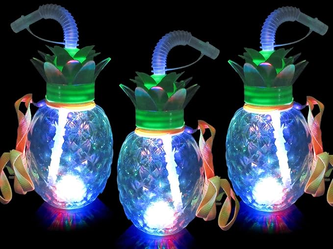 縁日、お祭り、イベントで大人気!トロピカルな雰囲気の可愛いパイナップルボトルです。底面外側にLEDライトがついており、飲み物を注ぎ底面にあるボタンを押すと全体がピカピカ光ってとても目立ちます。葉っぱの部分からストローを差し込みチューチュー飲めて、ストラップで首から下げて持ち運ぶこともできます。 お好みの飲み物を入れて楽しんでください。お祭りやイベントなどで飲み物を入れてお客様に提供頂くにもオススメです。