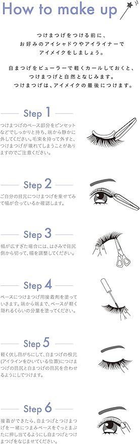 ・本来の用途以外には使用しないでください。 ・お肌の弱い方、アレルギー体質の方や皮フに異常のあるときは使用しないでください。 ・かぶれ、ただれ、赤み、発疹等、異常が現れたときは使用を中止し、皮フ科専門医等に相談してください。 ・危険ですので、つけまつげをまぶたにつけたままカットしないでください。 ・お子様の手の届かないところに保管してください。 ・火気の近くや直射日光の当たるところ、高温多湿になる場所を避けて保管してください。 ・つけまつげは1つ1つ手作りで製造されています。製品ごとに形状や仕上がりに若干バラつきがありますのでご了承ください。 ・つけまつげは破損しやすい繊細な商品ですので、トレーからの取り外しや取扱いにはご注意ください。 ・つけまつげの根元をピンセットなどではさみ、端の方からやさしく持ち上げトレーから剥がします。 ・市販のつけまつげ用グルーをうすく均一につけます。さらに目頭と目尻の部分にはしっかり付けます。 ・目頭に合わせてまぶたを軽く押し付けるようにつけます。