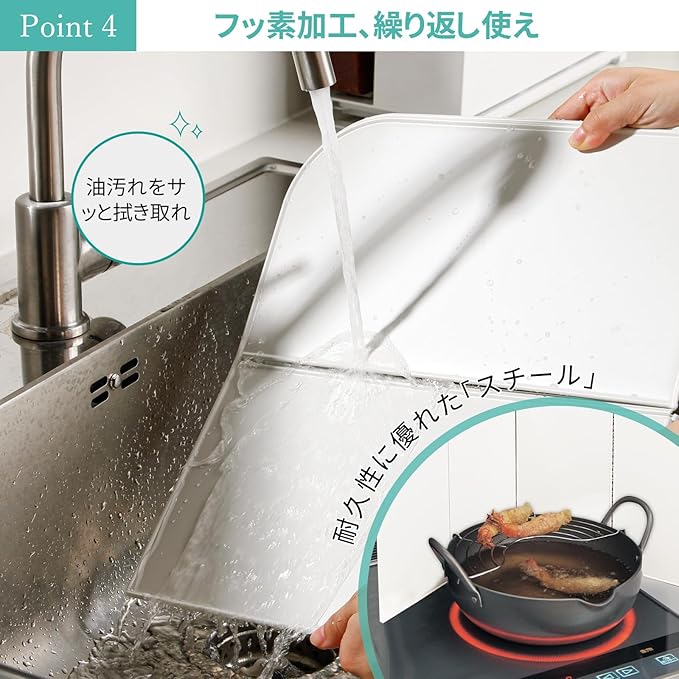 「油はね・飛び散りをしっかりガード」ジャバラに折れる4面式は、調理スペースに合わせて囲み方を自由に変えられる!揚げ物や炒め物などの調理中に、コンロ周りや鍋、フライパン周りに立て、それ以上油が飛び散らないようにしてくれます。キッチンの壁やコンロ周りの油汚れを手軽に予防することもできます。