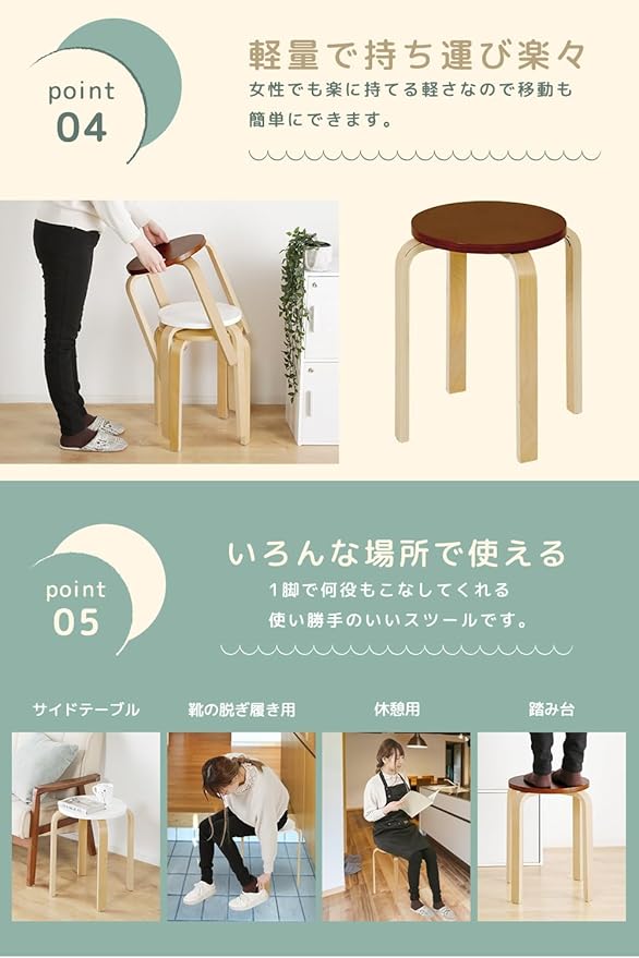 【軽量で持ち運びしやすく家中で活躍】軽めの設計で女性でも持ち運びしやすく、使いたい場所へサッと移動可能。掃除や模様替えの際も扱いやすく、日常使いに便利なスツールです。