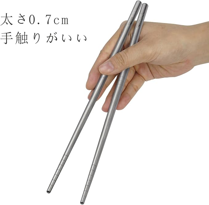 【滑り止め&中空構造】チタン箸の先端に滑り止め構造により小さいや丸状食べ物或いは細長い麺等を取っても落ちにくい、使い勝手がいい。本体が中空構造なので、持ち手に負担をかけません。熱伝導率が低いですので、料理から熱がうばわれにくいため、アツアツの料理が食べられる傍ら、箸自体は熱くなりにくいです。箸はチタン製ですから(金属製品)、ぶつかると音がします。 お気になる方は、購入しないでください。