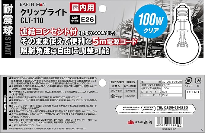 高儀(Takagi) EARTH MAN クリップライト 100W 耐震球 CLT-110【連結コンセント付】【口径E26】【照射角度調整】 作業灯 工事用 現場 ライト 照明 投光器 植物育成 たかぎ TAKAGI