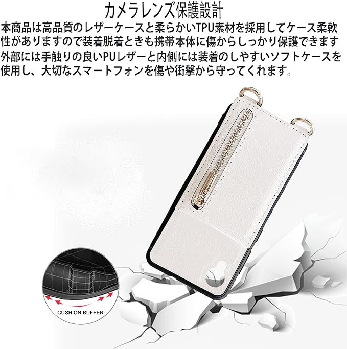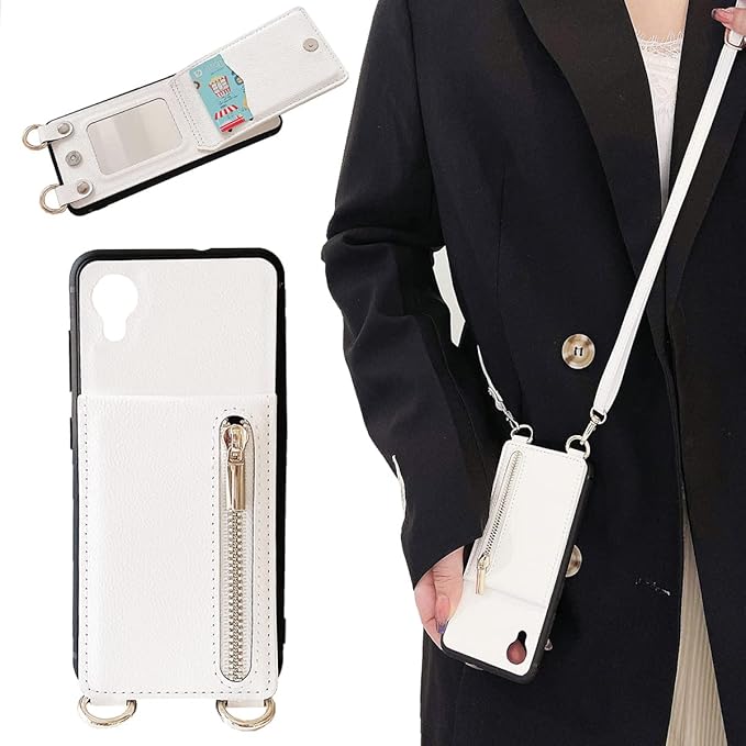 Galaxy A22 ケース 高質レザー Galaxy A22 カバー 肩掛け 首かけ 斜めがけ SC-56B ケース ショルダー ギャラクシー A22 ケース ミラーケース A22 5G ケース 便利 カードポケット スタンド機能 落ち着いた色 調節可能 軽量 多機能 縦置き ICカード収納 財布型 耐衝撃 携帯 鏡付き ケース ホワイト
