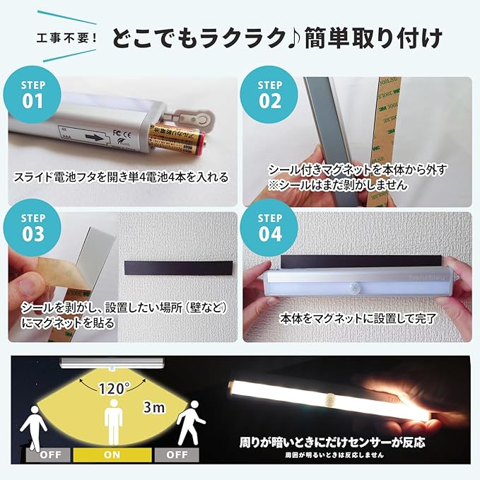 ✅ <感度と明るさにこだわった人感センサーライト> 人や物の動きにセンサーが反応して、パッと明るく点灯します。(約1m~最大3m以内で反応)自動的に電源がON/OFFされるため、電気代の節約にもつながります。 センサーの感度が良いため、「ライトが消えない」というお声をいただくことがあります。人以外に、物の動きにも反応して点灯する場合があるので、設置場所や角度などを調整してから取り付けてください。
