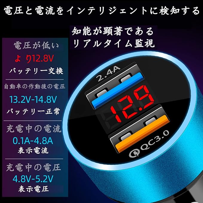 【LEDディスプレイ・電圧観測】 ブルーLEDライトを搭載しています。夜間の暗い車内でもUSBポートが一目で確認可能。LEDディスプレイを搭載する車載充電器。車のリアルタイムの電圧を表示可能。