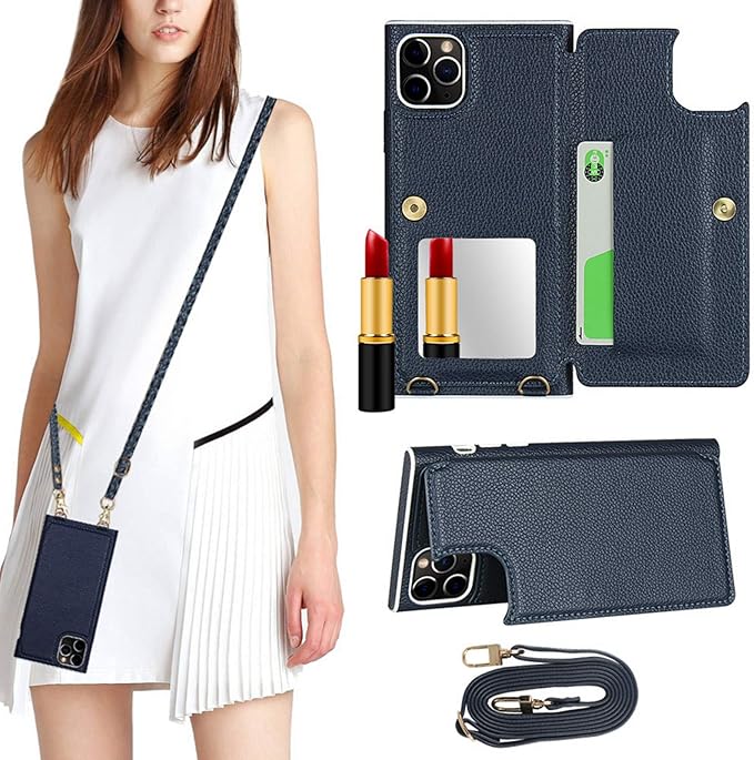 アイフォン11Pro MAX カバー アイフォン11Pro MAX ケース 手帳型 iPhone 11Pro MAX スマホケースiPhone 11Pro MAX 手帳型ケースJaorty 高質PU合成皮革 ミラー付き 肩掛け 首かけ 斜めがけ ショルダー ストラップ付き 4色-ネイビー