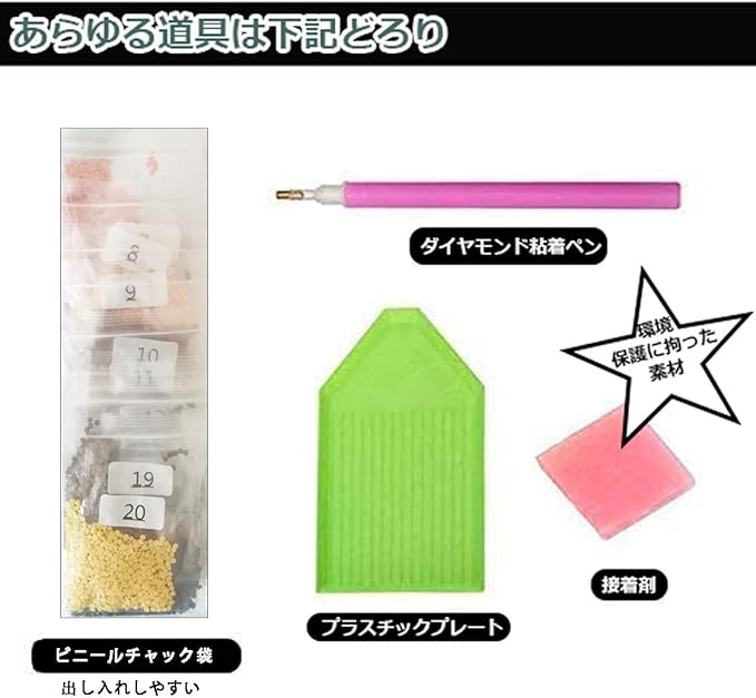 【パッケージに含まれるもの】ビニールチャック袋に入れたダイヤモンドピース、プラスチックブレード、接着剤、ダイヤモンドペン