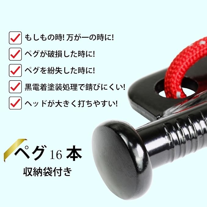 打ちやすいヘッドデザインでハンマーからの打撃を確実にボディに伝えガンガン刺さります。反射材入りロープ付の為夜中の撤収時、ペグの位置がわかり簡単に回収出来ます。忘れ防止の目印、つまずき防止に役立ちます。