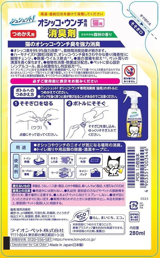 シュシュット! オシッコ・ウンチ専用消臭剤 猫用 つめかえ280㎖ 3個セット ライオンペット