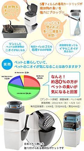 カートリッジをセットし、フイルムを引き出し端を結び取り出し口を閉めて準備完了。付属のスコップで排泄物を入れ、蓋を閉めてハンドルを引く。いっぱいになったら取り出してフィルムの端を結んで捨てるだけ。
