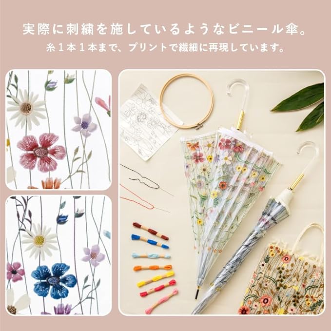 糸の1本1本や凹凸感まで細かくプリントした、まるで刺繍を施しているようなビニール傘。