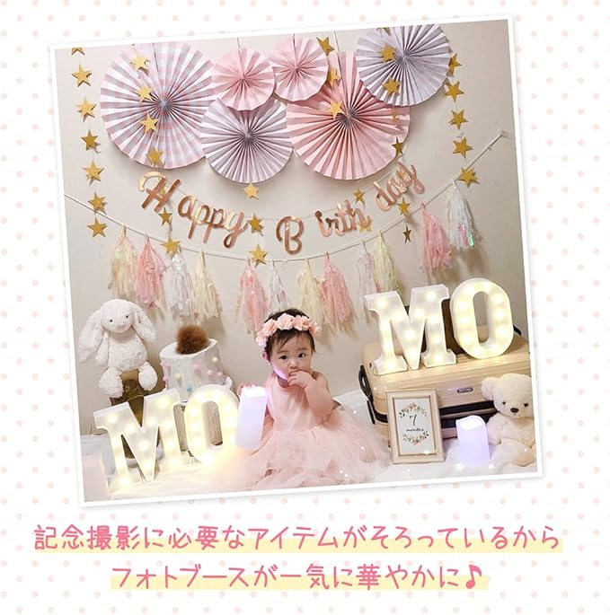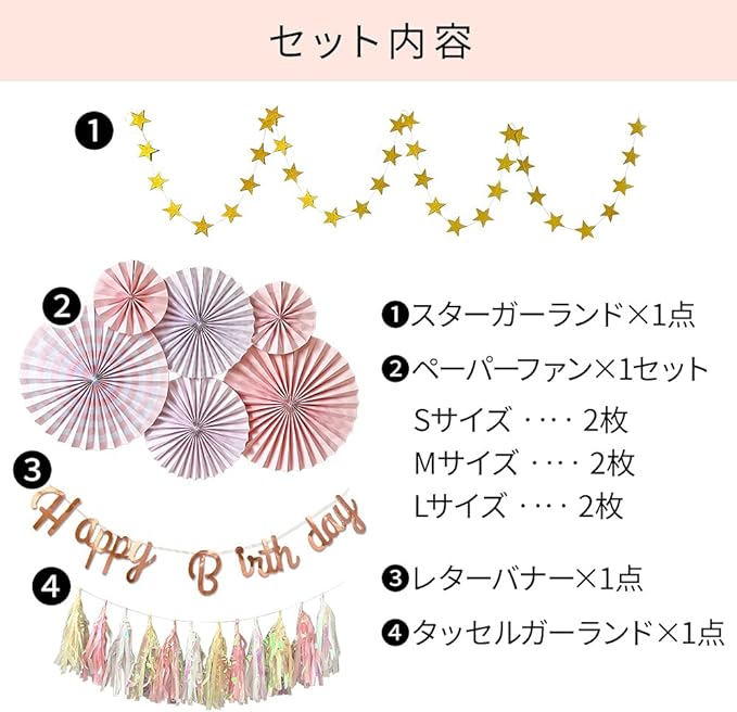 regalo 誕生日 飾り付け 女の子 セット ガーランド デコレーション HAPPY BIRTHDAY ペーパーファン 装飾 お祝い 記念日 (ミルキーピンク)
