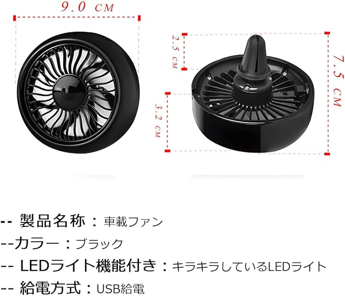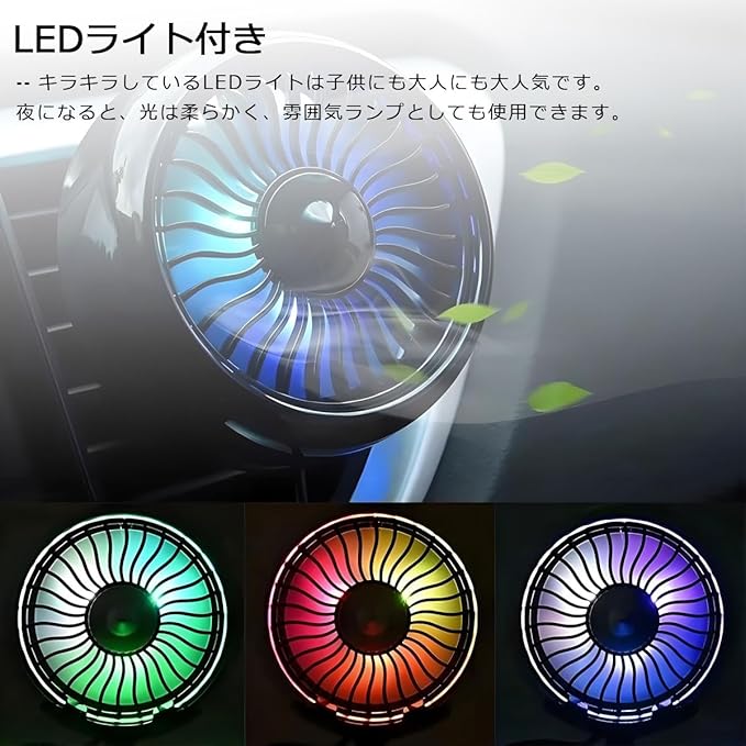 小型 軽量 大風量 車載扇風機 ・LEDライト機能付き 強風量 省エネ 夏対応 車用 USBファン・3段階風量調節 角度調節360 回転 7枚羽根 車用扇風機「エアコン取り付け型」日本語説明書
