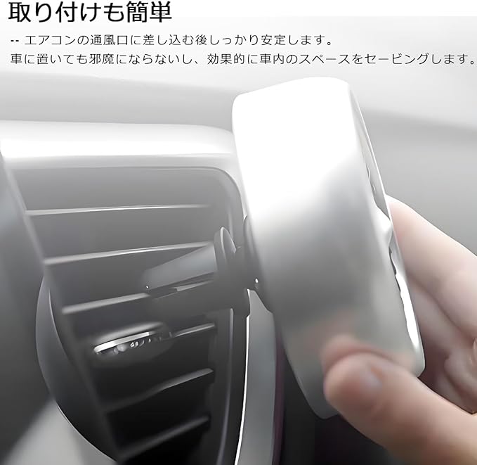 2.「 エアコン取り付け型」本体は小さくて(9.0cm*7.5cm)、コンパクトの設計で、車に置いても邪魔にならないし、効果的に車内のスペースをセービングします。取り付けも簡単、エアコンの通風口に差し込む後しっかり安定します。