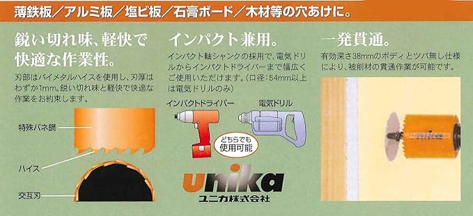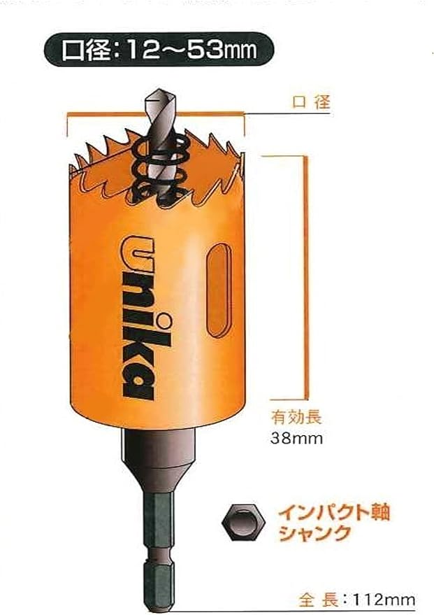 鋭い切れ味。軽快で快適な作業性。刃厚1mm。安全ストッパー(ツバ)を排除し、貫通穴に最適。木材・塩ビ・鉄板などの穴あけに。6.35mm六角軸のため、インパクトドライバー・電気ドリルどちらでも使用可能。ボール盤使用不可。刃先はコバルトハイスを採用したバイメタル構造。板厚38mmまで対応。シャンク:6.35mm六角軸。口径:53mm。有効長:38mm。全長:112mm。対象資材:薄鉄板(3.2mm厚以下)・アルミ板(3.2mm厚以下)・塩ビ板・金属系サイディング・石膏ボード・木材・FRP板・樹脂板。