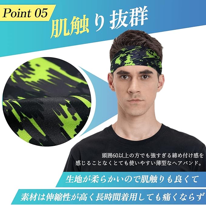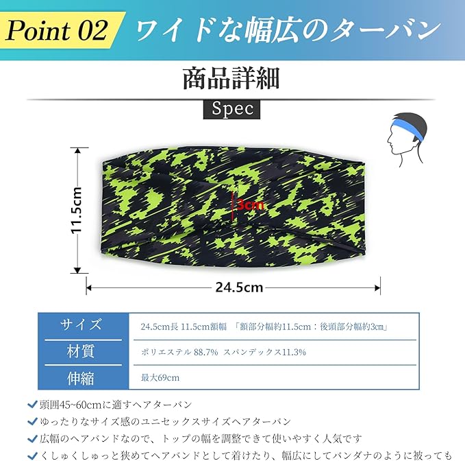 ✅【ヘアバンド仕様】材質:ポリエステル 88.7% スパンデックス11.3% ターバン約24.5cm長、約11.5cm額幅 「額部分幅約11.5cm:後頭部分幅約3㎝」 額部分の面積が広く、吸水性が抜群なヘアバンド。
