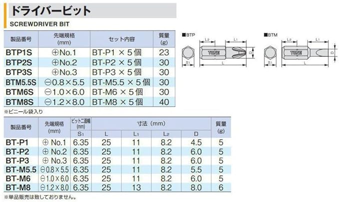 トネ(TONE) ドライバービット BTP3S ビット差込 (+)No.3 内容5点