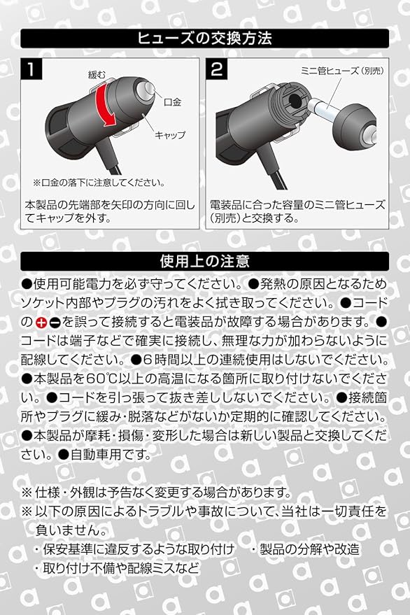 ON-OFFスイッチ付き・使用可能電力:DC12V車60W以下/DC24V車60W以下・コードサイズ:0.5sq相当-約1m・ミニ管ヒューズ5A内蔵(24V車で使用する場合は別途2.5A以下のミニ管ヒューズに交換してください。)・アクセサリー照明LED(青)付・プラグサイズ:直径φ20.6/挿入部43mm