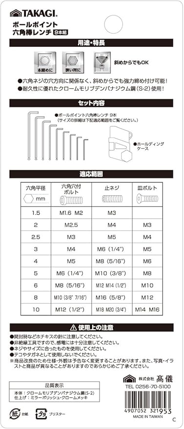 高儀 TAKAGI ボールポイント 六角棒レンチ 9本組