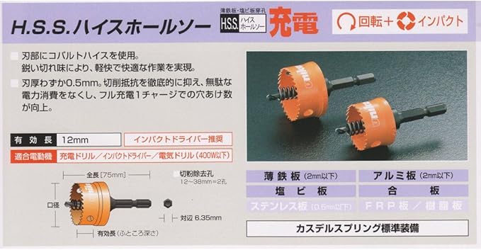 ●刃部にコバルトハイス(SKH-51)を使用。鋭い切れ味により、軽快で快適な作業を実現。刃厚わずか0.5mm。切削抵抗を徹底的に抑え、無駄な電力消費をなくし、フル充電1チャージでの穴あけ数が向上