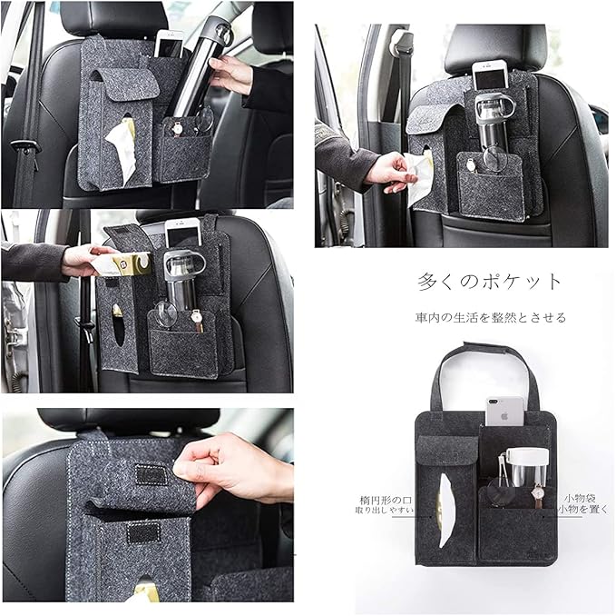 【多くのポケット】商品には多くのポケットがあり、ティッシュを入れるポケットには楕円形の開口があり、抽出しやすいです。二つの小さいポケット、上のはスマホとカードなどを置いて、使いやすいです。下には腕時計のサングラスなどの小物を収納するところです。真ん中の大きな袋に水筒や傘などを入れます。車内の生活を整然とさせる。