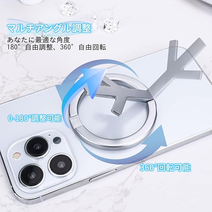 【横・縦自由に調整】可動部分が2箇所あって、360 回転のリングと180 自由に回転できるホルダー。お好みの角度に簡単に調整でき、縦置き、横置きどちらでもよく、両手を解放しながら最高の視覚体験を提供します。スタンド部分も折り畳み式なので、そのままポケットに入れても邪魔にならない。