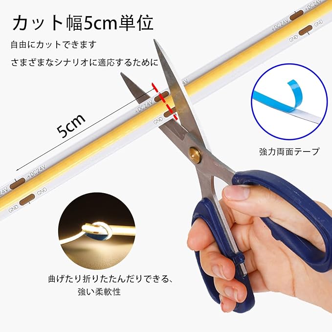 【健康と環境保護】LEDライトはハサミなどでカットすることが可能です。貼り付ける場所に合わせ長さを変えて使用することが出来ます。※カット幅は5cm単位。COB LEDテープライトにはCOB発光面があり、光束角180 ,光は均一で柔らかく、効果が優れています。快適で柔らかく、肌や目に無害。発色指数が高くて、照明効果がいいです。
