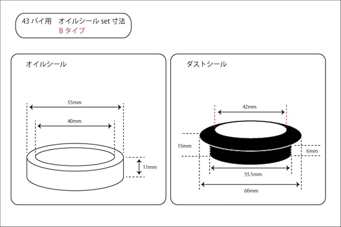 オイルシール寸法 : 外径 55mm、内径 40mm (43パイ用。内部のリブ含み実寸で40mm) 、厚さ 11mm・セット内容 : オイルシール 2個、ダストシール 2個