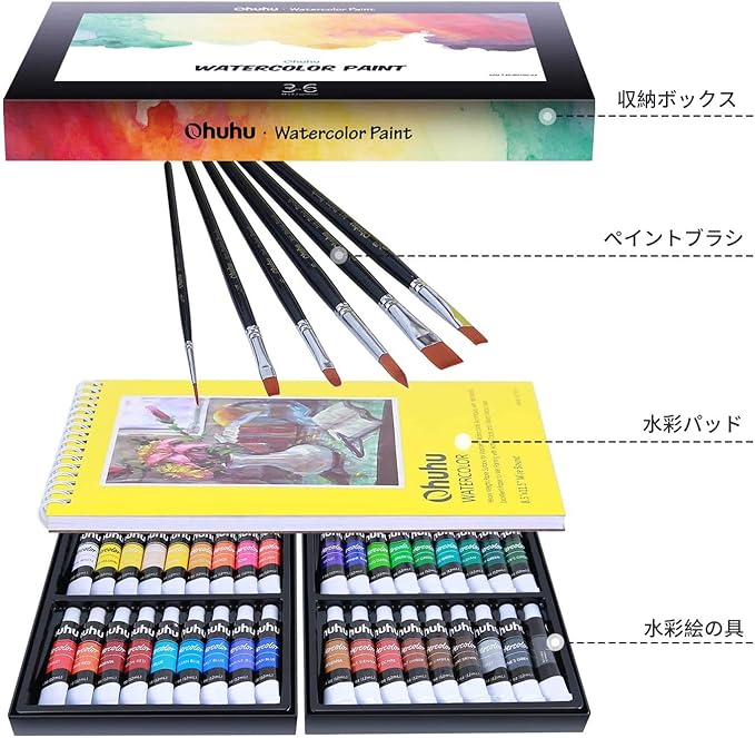 Ohuhu 水彩絵の具セット 36色 6本水彩筆 絵の具 絵具 水彩画セット画材 絵画 透明水彩 白 男の子 女の子 大人 初心者 藍色 12ml