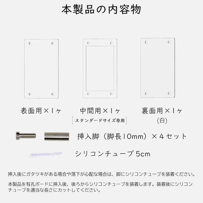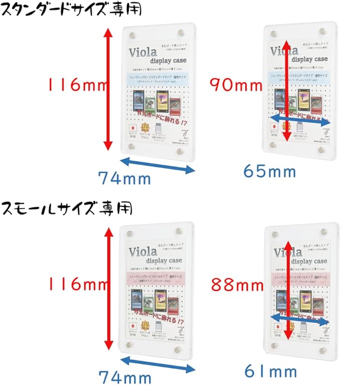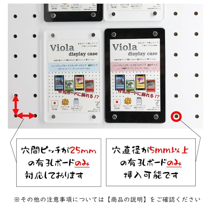 トレーディングカード スタンダードサイズ専用のアクリルケースです。 穴ピッチ25mmの有孔ボードに直接挿して飾ることができます。 スタンダードサイズ専用のスリーブを装着することで、カードをずれなく飾ることができます。