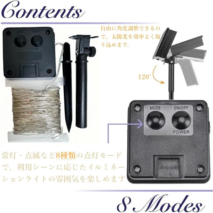 【選べる8種の点灯モード】こちらのイルミネーションライトの点灯パターンは8種類(常灯、波打つような点灯、交互に明滅、スピーディーに明滅、交互にゆっくり明滅、徐々に点灯、ゆっくり明滅、ランダム)雰囲気にあったお好みのパターンをお楽しみください。(ご注意:曇天が続くなど天候が悪化すると、十分な充電が行えず光り方が弱くなったり点灯時間が短くなりますのでご注意下さい)
