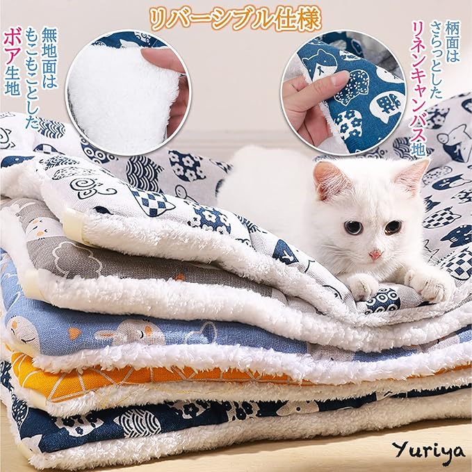 【リバーシブル一年中使える 】さらっとした肌触りのリネンキャンバスの柄面とフワフワぬくぬくボア面のリバーシブル仕様なので、一年中快適に使えるペットマットです。肌寒い季節に冬用のもけもけあったか面にして、ふわっとした毛足でずっと触れていたくなる柔らかさで、フミフミが止まらないよ~暖かくなったら、かわいい柄面に変えられて、夏場もスヤスヤ眠ります。