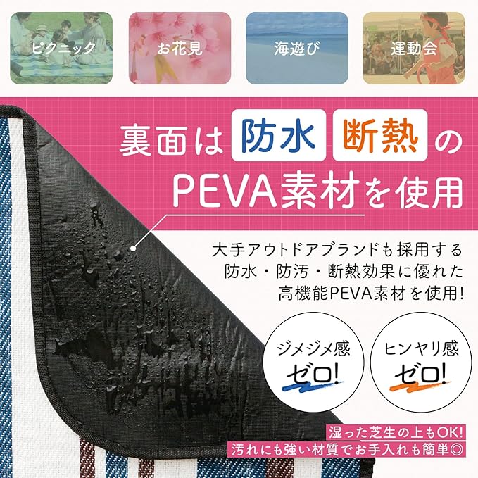 表面はポリエステル素材の柔らかな肌触りが心地よく,裏面はPEVA素材で地面や草からの湿気を防いでくれます。