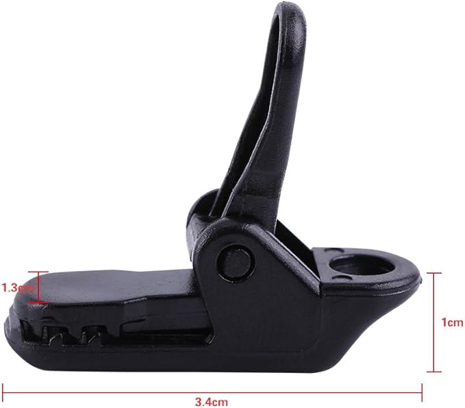 パッケージ内容:20個入りテント固定クリップセット、サイズ33 10 13mm、穴径5mm、重量2g/個、カラー:ブラック
