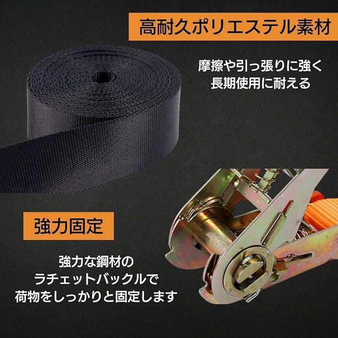 【高耐久・強力固定】このラチェット式荷締めベルトは、摩擦や引っ張りに強いポリエステル素材を採用。耐久性に優れ、荷物を安全に守ります。鋼材製のラチェットバックルは、より強力な固定力を提供し、荷物をしっかりと保持します。
